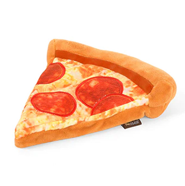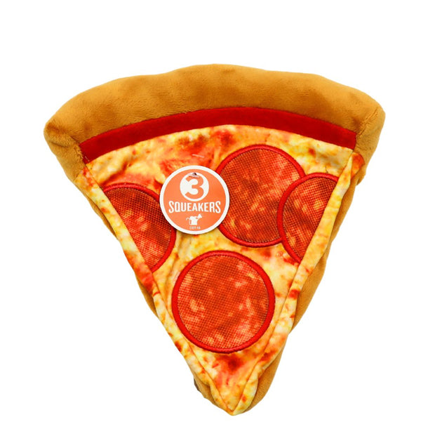 Bring the flavor of fun to playtime with P.L.A.Y.'s Snack Attack Puppy-roni Pizza toy! Available in two sizes, this slice of joy features three squeakers for maximum excitement and a t-shirt rope hidden in the crust to mimic the dough-like texture. It’s a mouthwatering toy that guarantees tail-wagging joy!